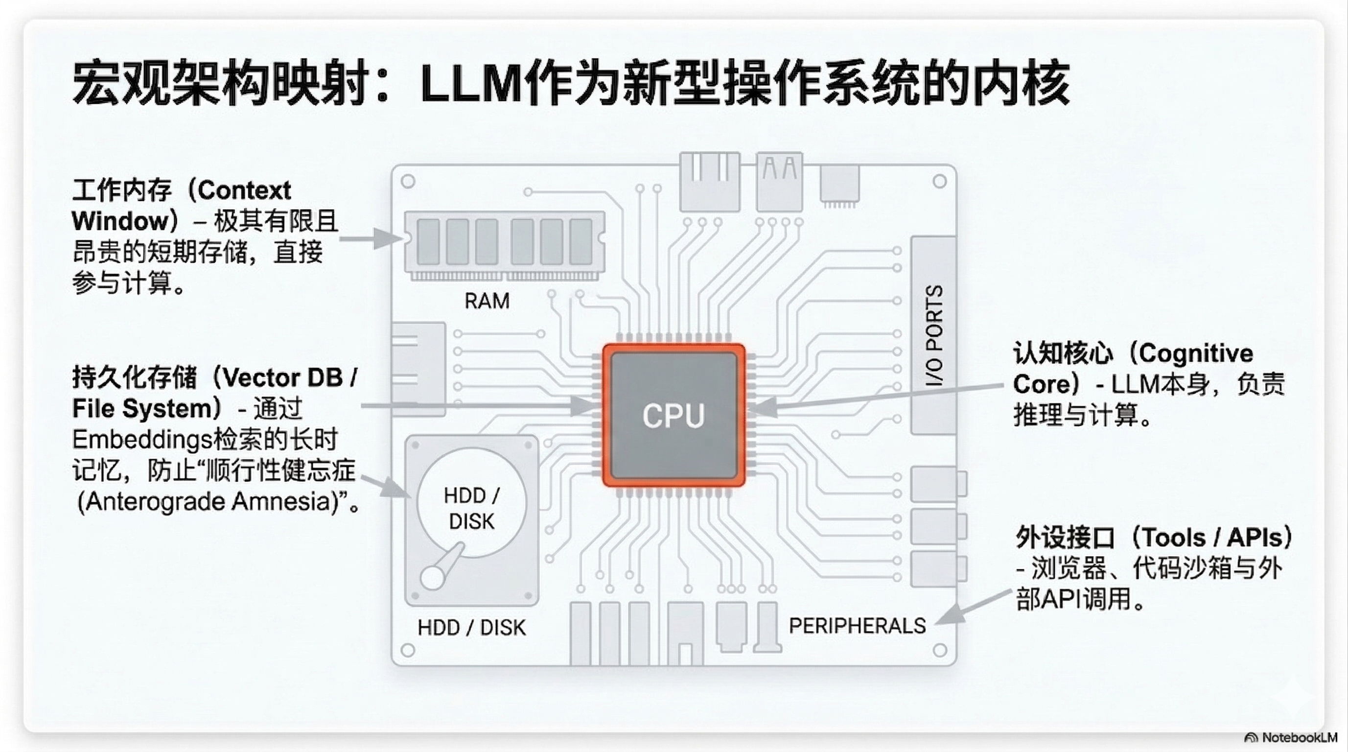- CPU(中央处理器): 大语言模型(LLM)本身负责指令处理、推理与决策5, 7。